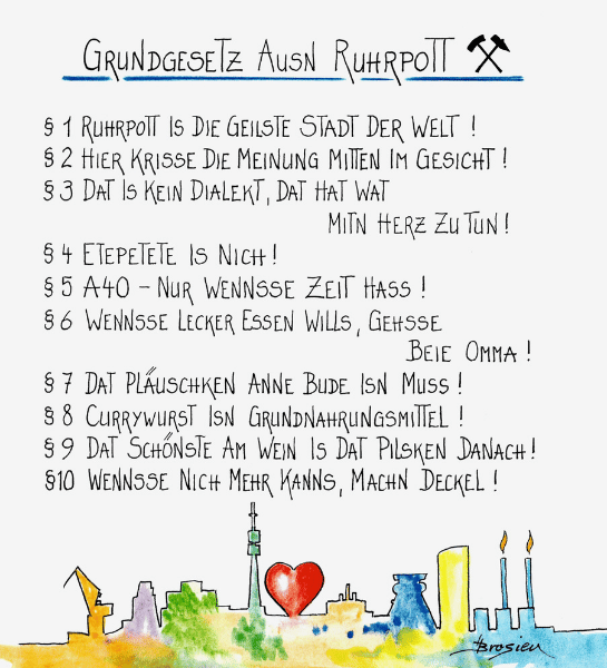 Das Passepartout-Bild „Grundgesetz ausn Ruhrpott“ von Heidemarie Brosien im Format 24 x 30 cm verbindet künstlerische Gestaltung mit regionalem Charme. Mit viel Witz und einem unverkennbaren Augenzwinkern wird das Grundgesetz in die direkte und herzliche Sprache des Ruhrgebiets übertragen. So entsteht ein originelles Kunstwerk, das zum Schmunzeln einlädt. Der liebevoll gestaltete Druck im Passepartout eignet sich hervorragend als Geschenk für Menschen mit Ruhrpott-Wurzeln oder als dekorativer Akzent, der jedem Raum eine persönliche und humorvolle Note verleiht.